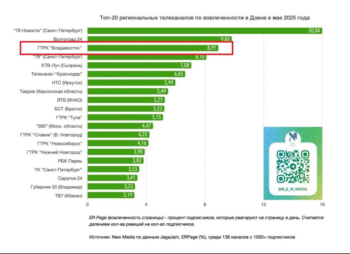 По данным телеграм-канала New Media, за май 2025 года, дзен-канал ВГТРК «Владивосток» занял третье место по вовлеченности аудитории (8,91%), т.е. количеству реакций, ежедневно фиксируемых системой. Одновременно наш дзен-канал находится на 15-м месте в ТОП-20 по просмотрам текстовых материалов и видерепортажей. За май наши новости до конца посмотрели и прочитали 330 000 раза.