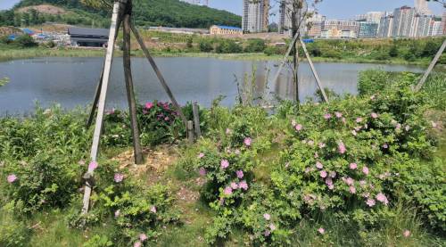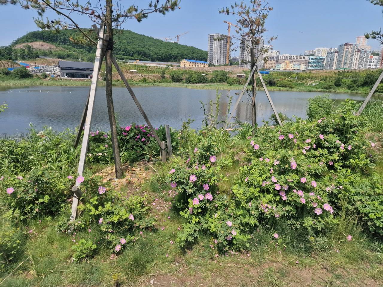 Деревьев высажены тысячи. Мы подбирали их вместе с учёными, чтобы и птицам было удобно, и людям приятно. Посмотрите на фото, как симпатично цветёт шиповник. Лет через пять здесь будет уже настоящий лес.