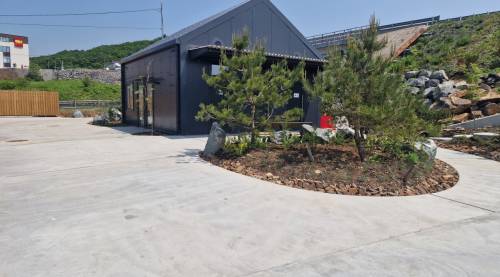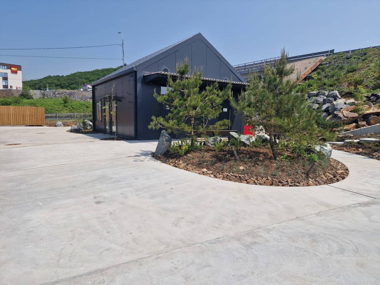 Мы расчистили часть берега бухты, чтобы показать, как должен выглядеть пляж. Это слева от мыса с соснами. Задача - иметь широкую песчаную полосу. Переодевалки и душевые будут чуть выше - они пока ещё строятся.