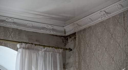 Это примерно четыре метра от места обрушения. Сейчас от греха подальше отсюда вынесли почти всю мебель. Комната пустует, а на потолке хорошо видна дранка.