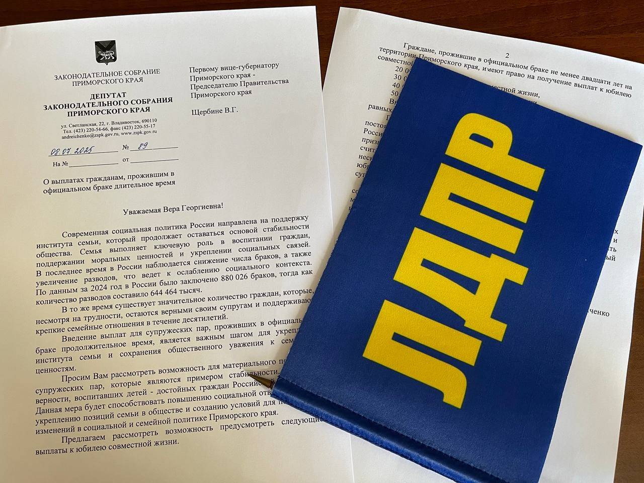 В честь Дня семьи, любви и верности глава Приморского отделения ЛДПР, депутат регионального парламента Андрей Андрейченко внесет в Заксобрание края законопроект, поощряющий семьи. Отсчет начинается с 20-ти лет совместной жизни, а сумма выплат равна количеству лет в браке.