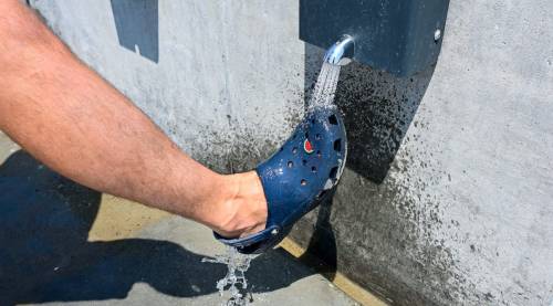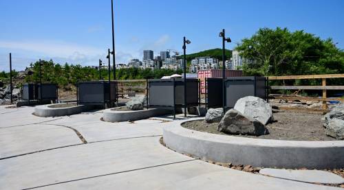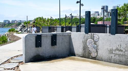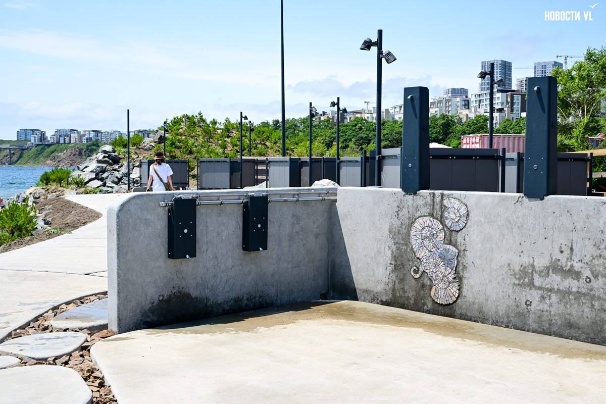 Береговая линия отливает свеженасыпанным жёлтым песком, на небольшом возвышении встали раздевалки, внутри которых есть крючки и подставки-стулья, также появились души и мойки для ног. Последние работают от кнопки в течение нескольких секунд, так что вандалы вряд ли смогут их как-то сломать. На бетонных плитах тут и там сидят небольшие бетонные крабы.