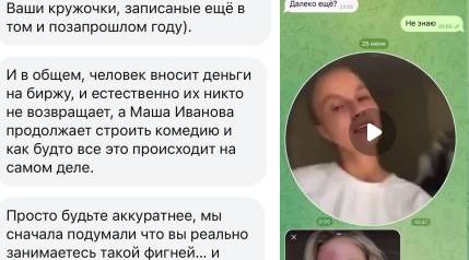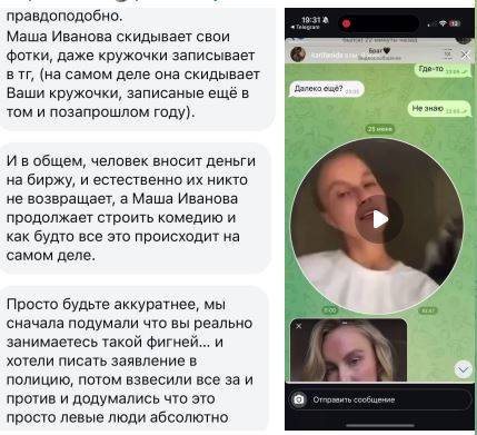 "Вчера написала девушка, ее брата, к сожалению, обманули с помощью моих фото/видеокружков из тг. Они даже хотели на меня писать заявление, потому что реально подумали, что там в ВК это я, но потом немножко поняли че к чему, и просто мне сообщили.