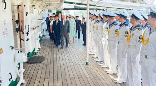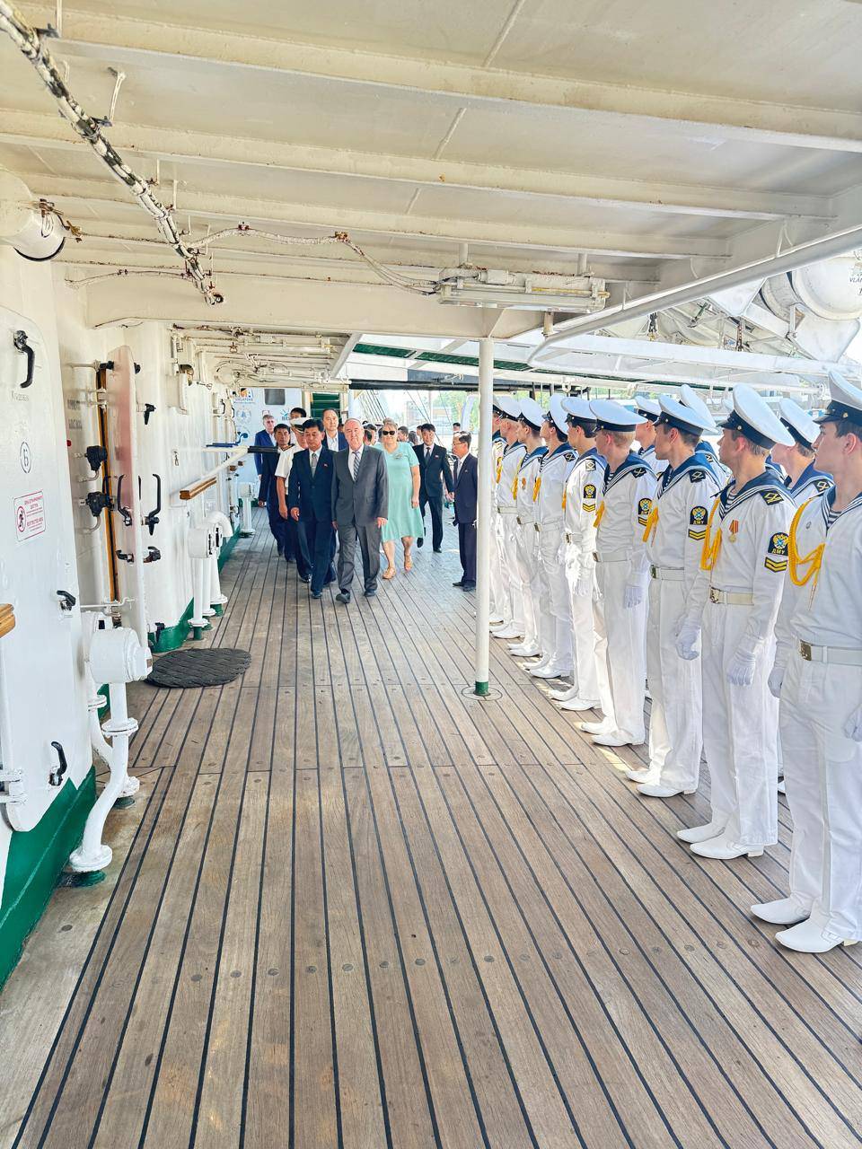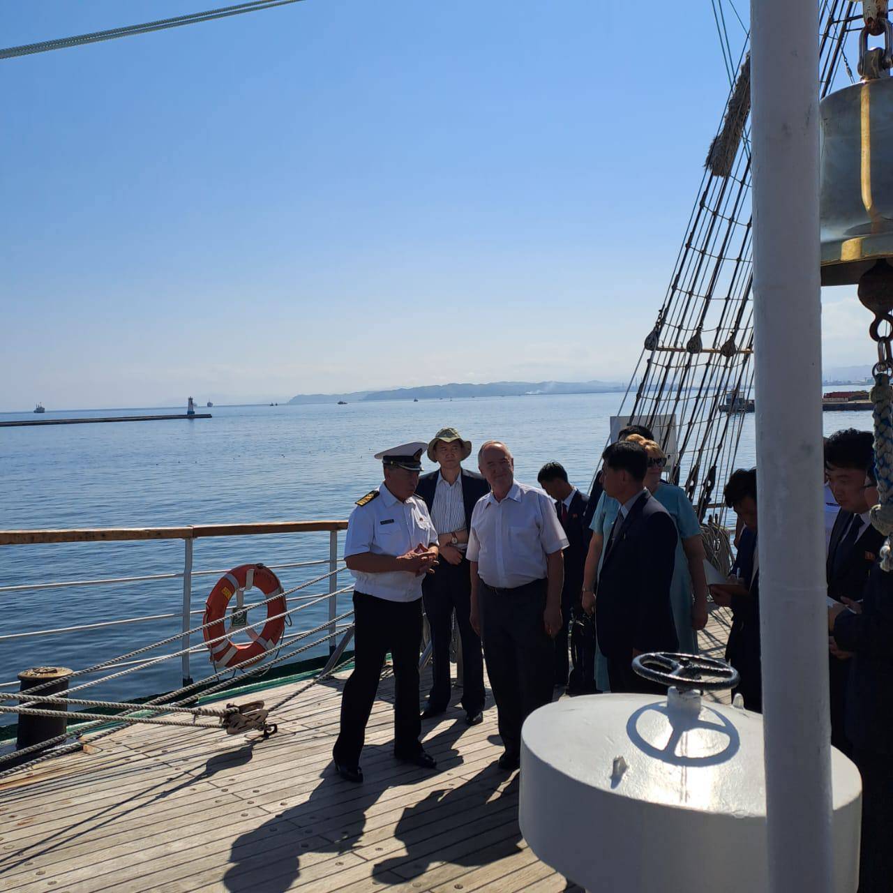 Генконсул России приветствовал почетный караул курсантов, учебный состав и экипаж, поздравив их с прибытием в Корейскую Народно-Демократическую Республику.