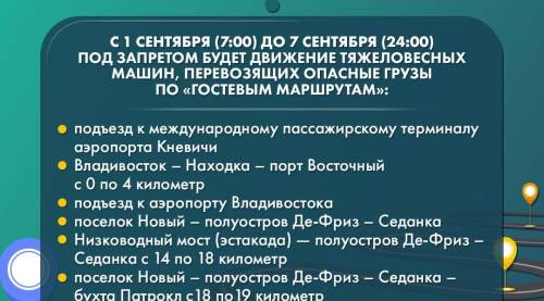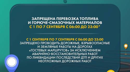 Запрет будет действовать с 7:00 31 августа до 24:00 7 сентября. Он распространяется на дороги, обозначенные в карточках.