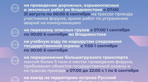 В пресс-службе правительства Приморья уточнили, в крае вводятся ряд запретов и ограничений на период Восточного экономического форума, сообщают «Вести:Приморье».