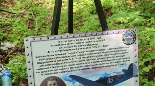 23 августа 1950 года над лесным массивом в районе бухты Тавайза, что в 50 километрах от Владивостока, произошло столкновение двух истребителей Як-9Т, выполнявших учебно-тренировочный полёт в паре. Ведущий лётчик, командир звена старший лейтенант Александр Сайдулин выпрыгнул с парашютом, а ведомый, лейтенант Герман Иванович Папенков не смог спастись и погиб вместе со своей машиной, сообщает телеграм-канал @aviapoisk_dfo.