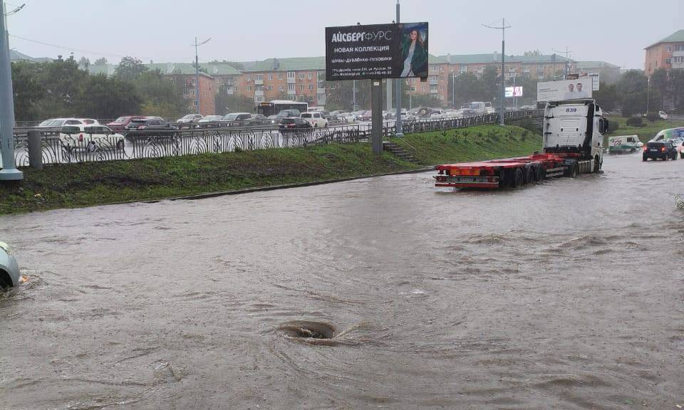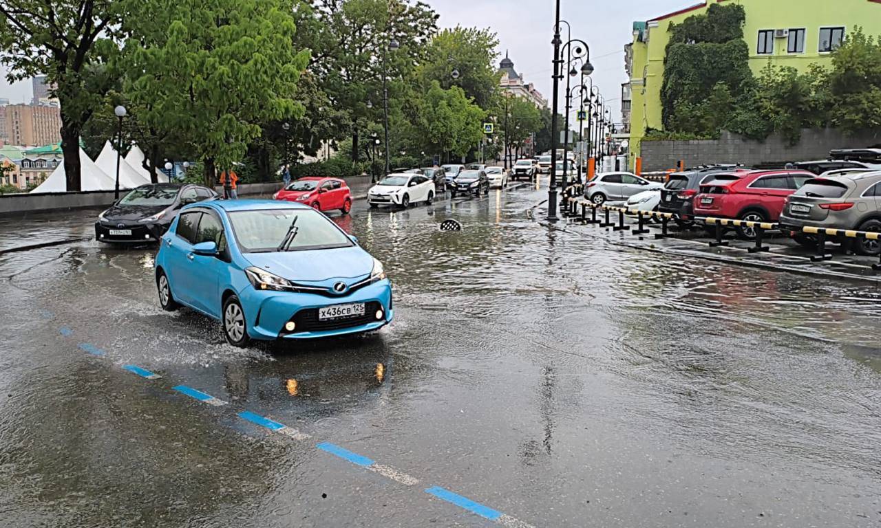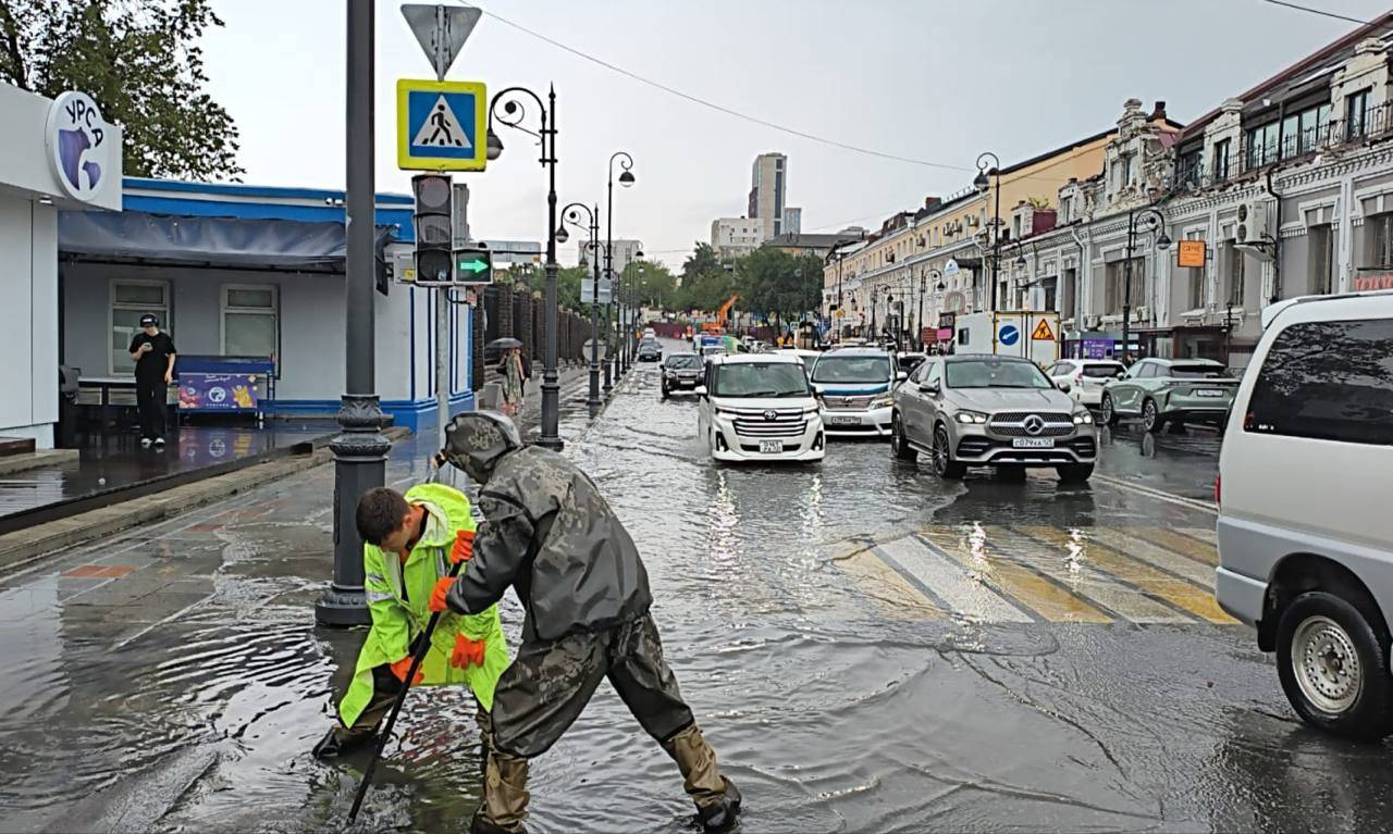 На улице Набережной в районе кинотеатра «Океан» бригада открыла ливневые решетки. Вода ушла с проезжей части.