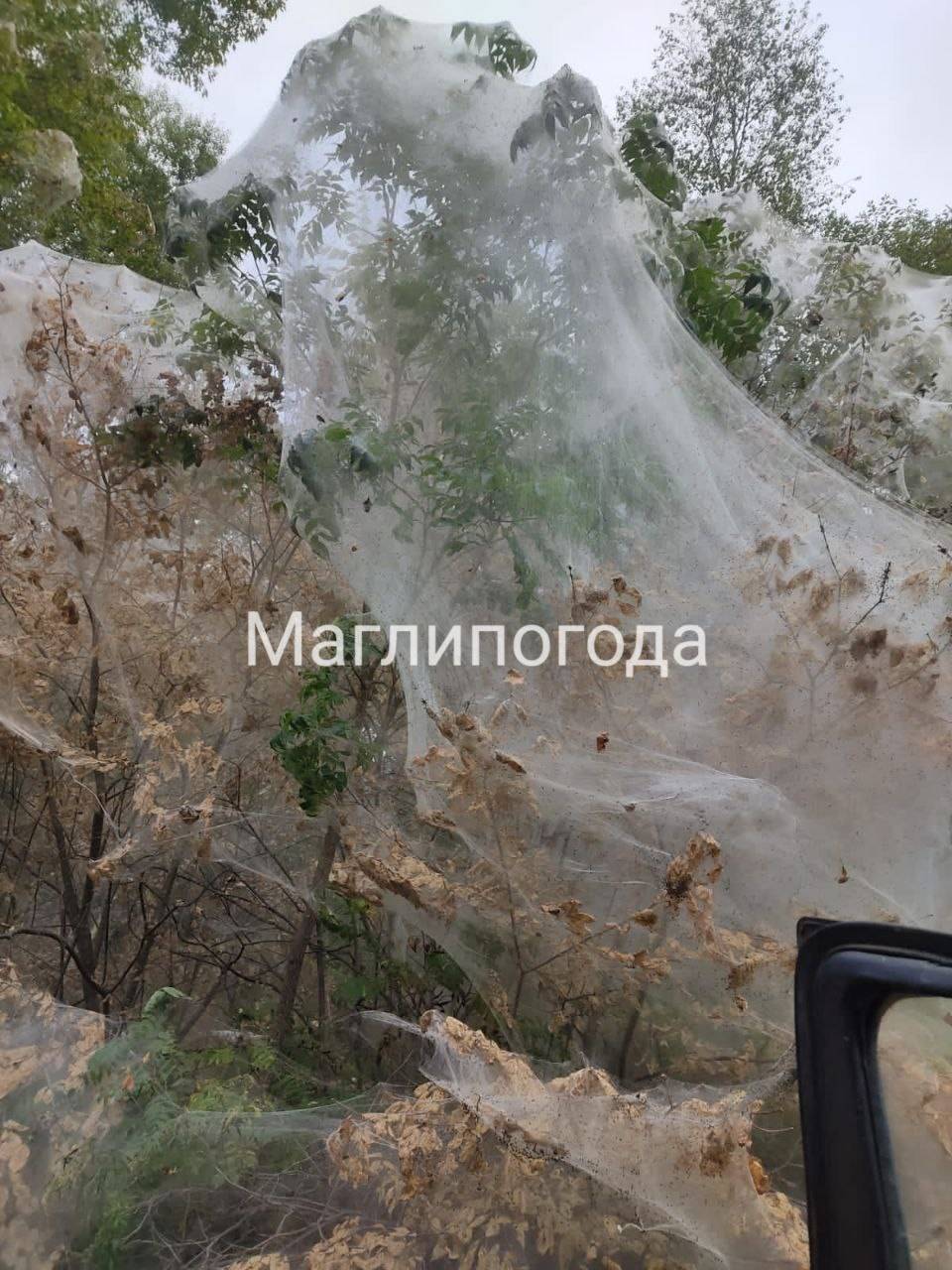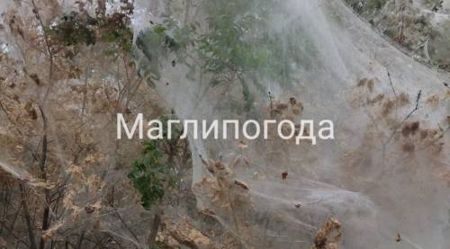 При этом в Сети уточняется, похожая картина, когда деревья словно окутаны плотными слоями нитей, остались без листвы. И всему весной не осень, когда деревья сбрасывают листву, а, нечто другое.