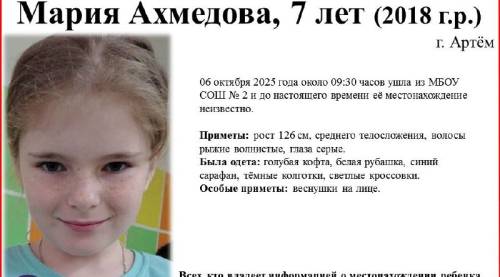 7-летняя Мария Ахмедова 6 октября 2025 года около 09:30 часов ушла из МБОУ СОШ № 2 в городе Артеме и до настоящего времени её местонахождение неизвестно, - сообщает "Вести: Приморье".