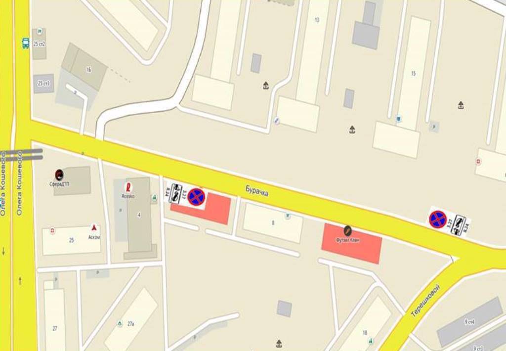 На участке от дома №6 до №10 по улице Бурачка скорректировали схему движения: теперь вдоль дороги запрещены остановка и стоянка автомобилей.