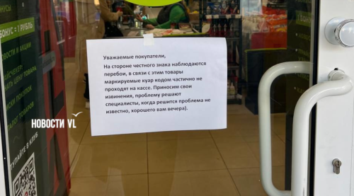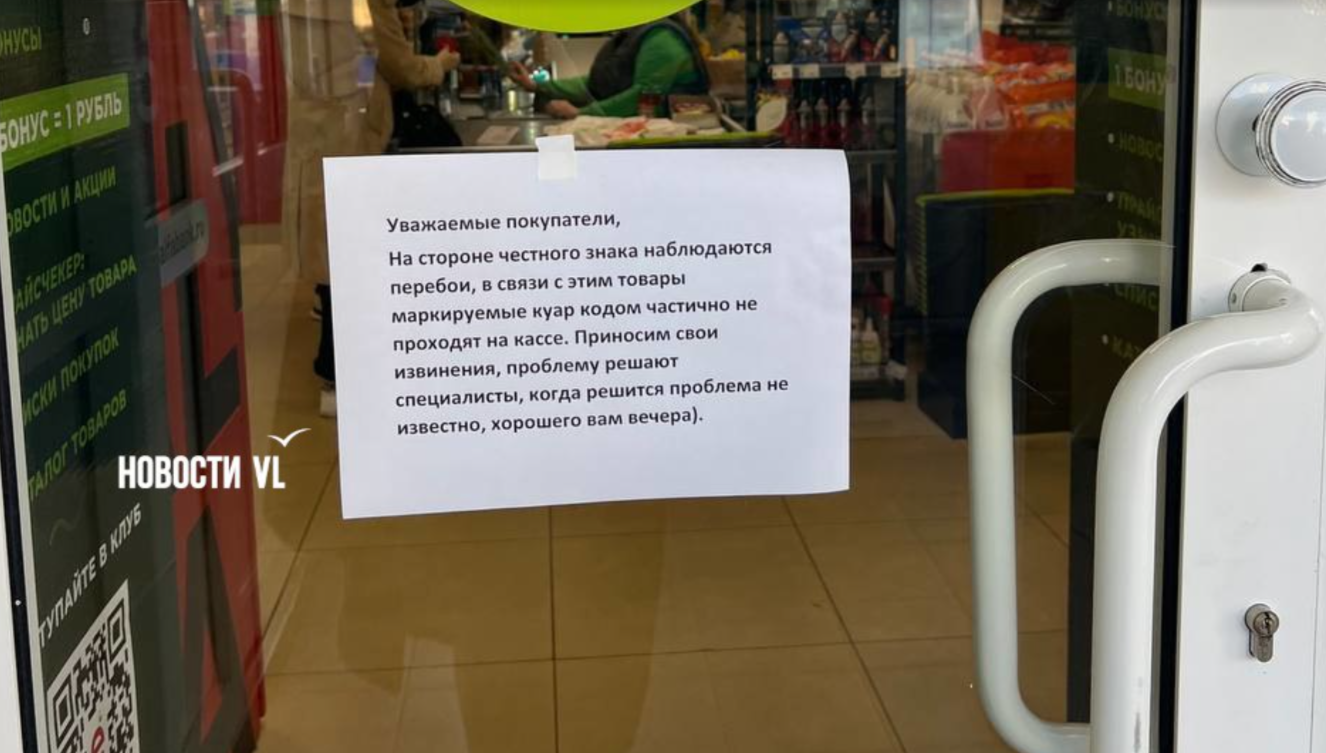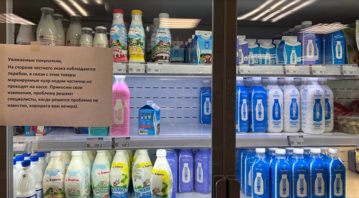 В некоторых магазинах Владивостока накануне с вечера появились объявления, что из-за неких сбоев на стороне «Честного знака» у покупателей могут возникнуть проблемы с приобретением товаров с маркировкой, например, молочной продукции, - сообщает "Вести: Приморье".