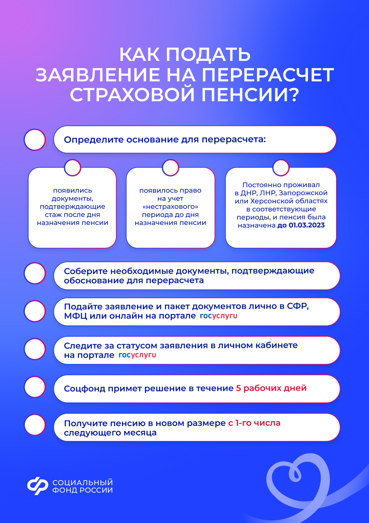 Сделать перерасчет пенсии можно в случаях, если у вас появились документы, которых не было при назначении пенсии; выработался необходимый стаж в сельской местности для получения надбавки; появились документы, подтверждающие право на учет «нестрахового» периода до дня назначения пенсии; а также если гражданин постоянно проживал на территориях ДНР, ЛНР (с 11 мая 2014 по 29 сентября 2022) или в Запорожской и Херсонской областях (с 24 февраля по 29 сентября 2022) и выехал в эти периоды за пределы данных территорий в Российскую Федерацию, и ему была назначена пенсия до 1 марта 2023 года.