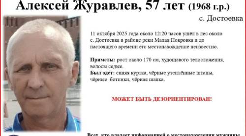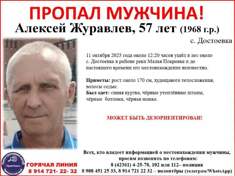 В Приморье объявлен сбор неравнодушных людей на поиск пропавшего Алексей Журавлева, - сообщает "Вести: Приморье". 57-летний мужчина накануне, 11 октября, ушел в лес в районе села Достоевка и пропал.