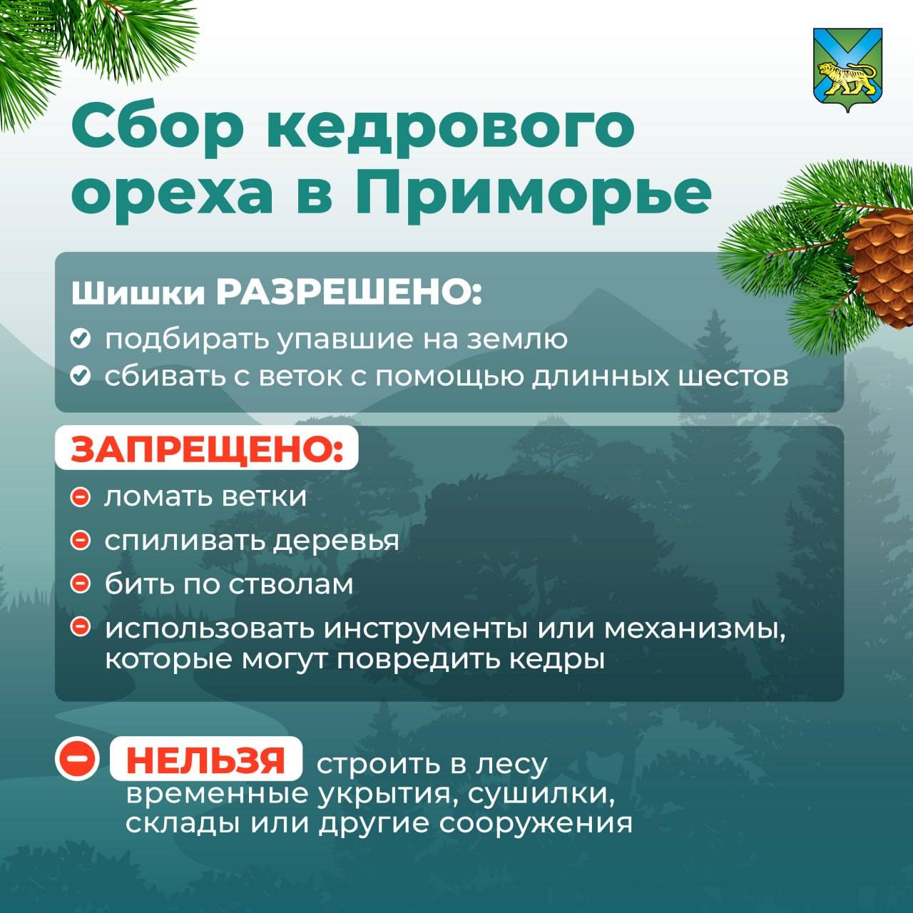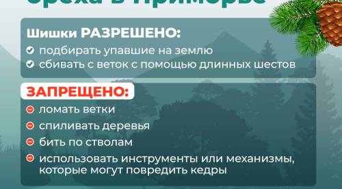 «Запрещено ломать ветки, спиливать деревья, бить по стволам, использовать инструменты или механизмы, которые могут повредить кедры. Нельзя строить в лесу временные укрытия, сушилки, склады или другие сооружения», – пояснили специалисты министерства.