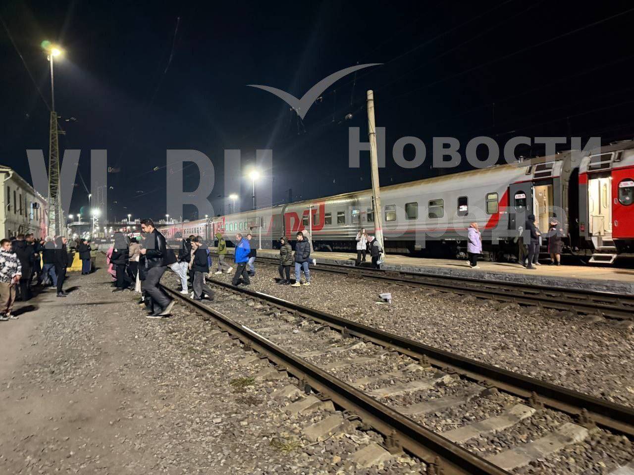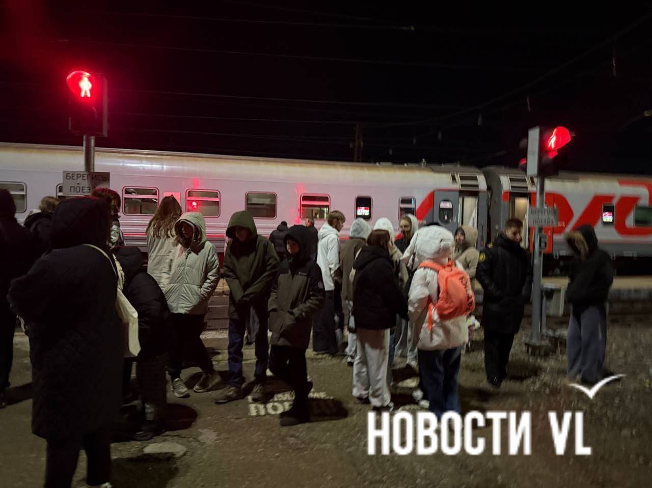 По данным NewsVL.ru, пассажиры изначально вышли на ближний перрон, но потом всех попросили отойти от вагонов к зданию вокзала.