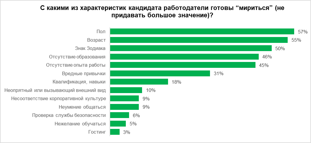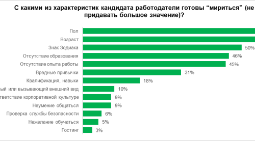 Каждый второй не обращает внимания на знак зодиака (50%), а 46% рекрутеров готовы нанять кандидата без опыта работы, еще треть респондентов не придают значения наличию вредных привычек (31%).