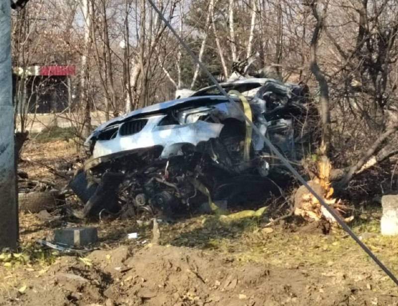 Автомобиль врезался в опору освещения и загорелся в Приморье