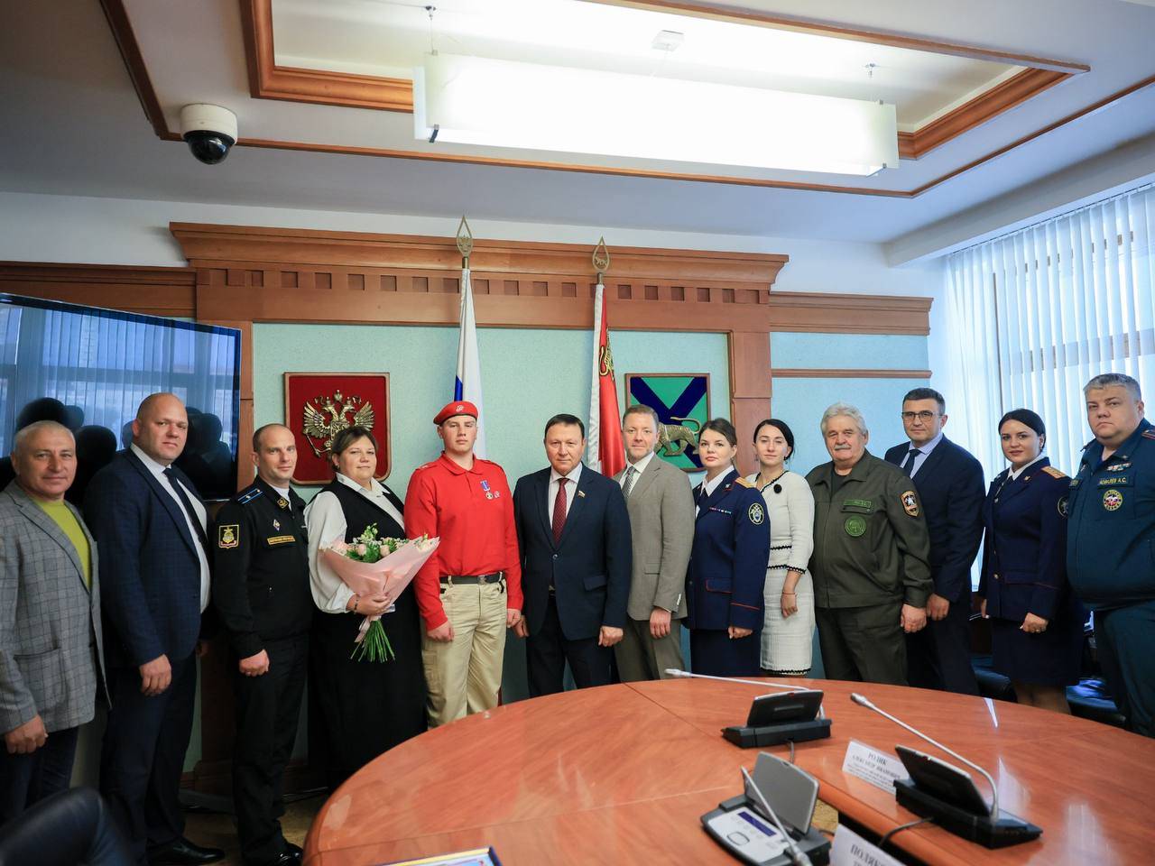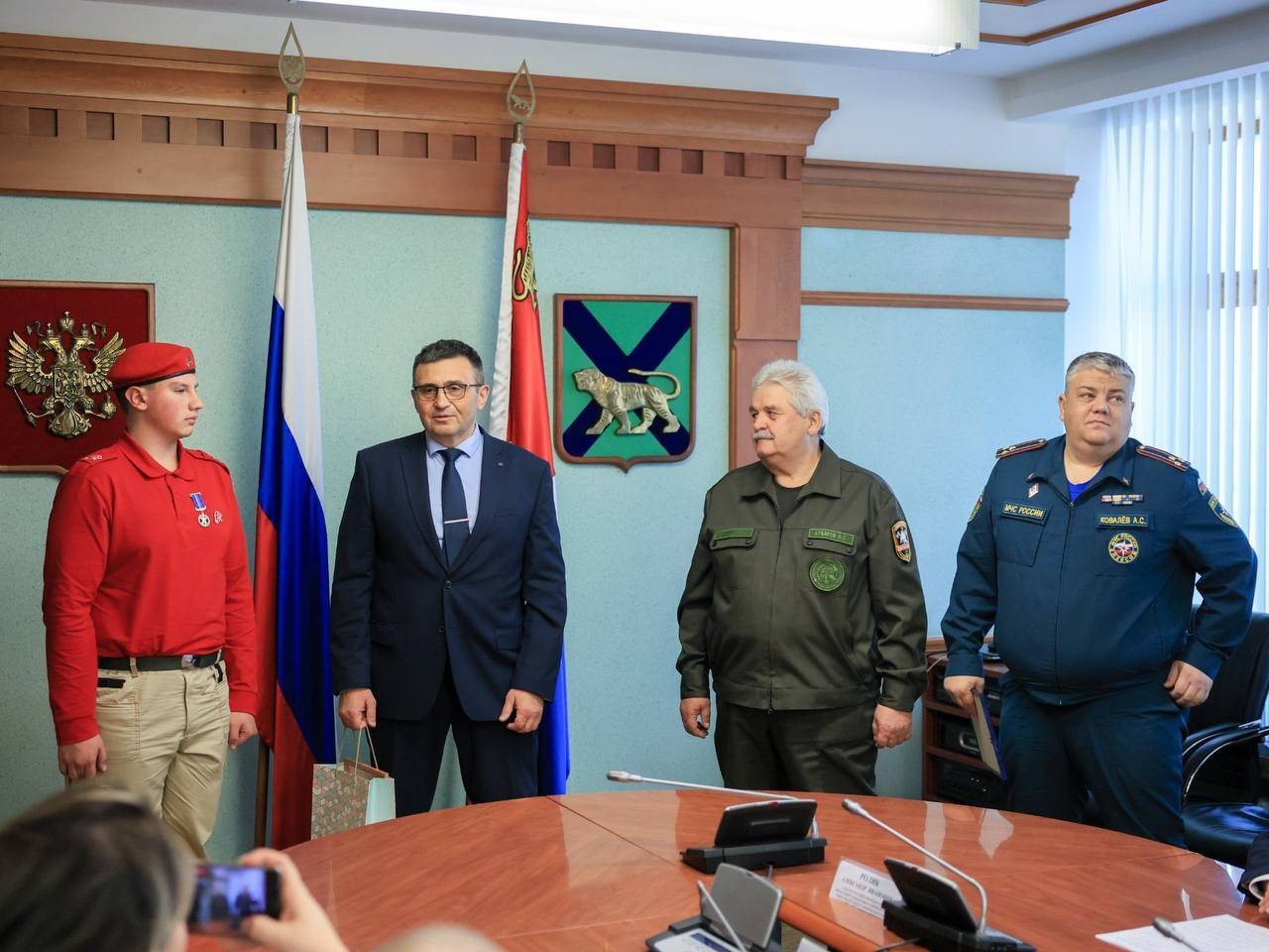 Министр по делам ГОЧС Александр Златкин и директор ГКУ Приморского края по пожарной безопасности, ГОЧС Анатолий Кубарев поздравили героя с наградой и вручили ценный подарок.