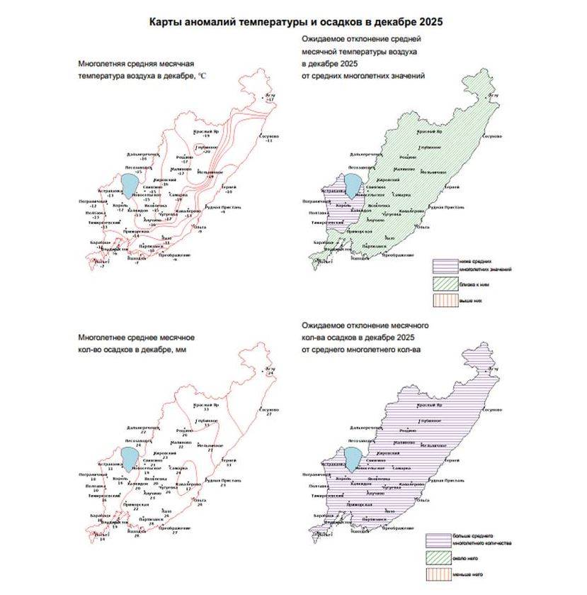 Прогноз аномалий температуры воздуха и осадков по Приморскому краю на декабрь 2025 года опубликован на сайте Примгидромета, сообщают "Вести:Приморье".