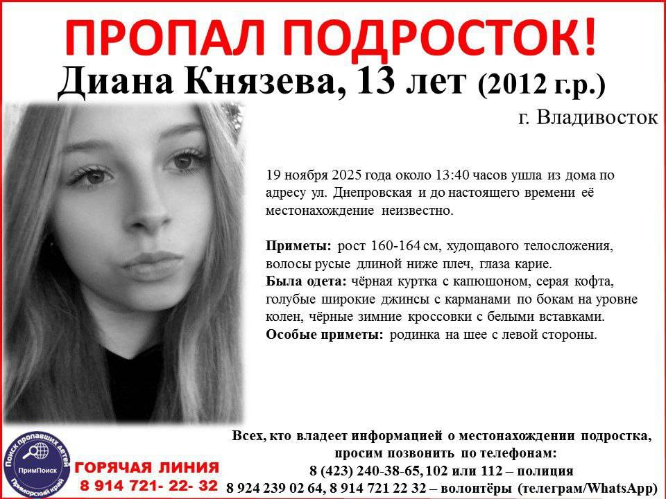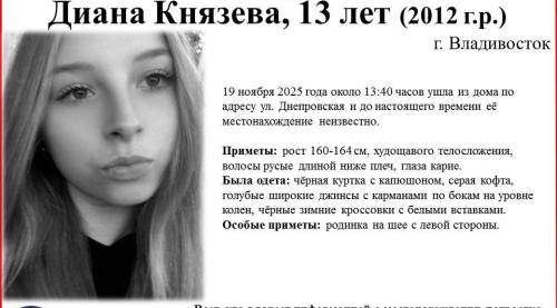 13-летняя Диана Князева 19 ноября 2025 года около 13:40 часов ушла из дома по улице Днепровской во Владивостоке и до настоящего времени её местонахождение неизвестно, - сообщает "Вести: Приморье" со ссылкой на "Примпоиск".