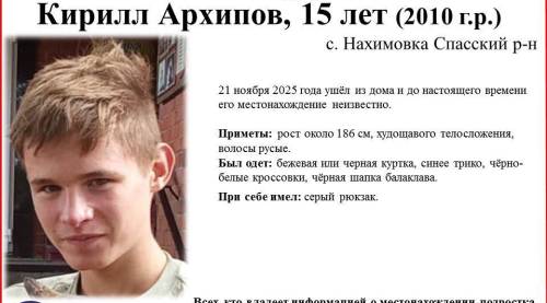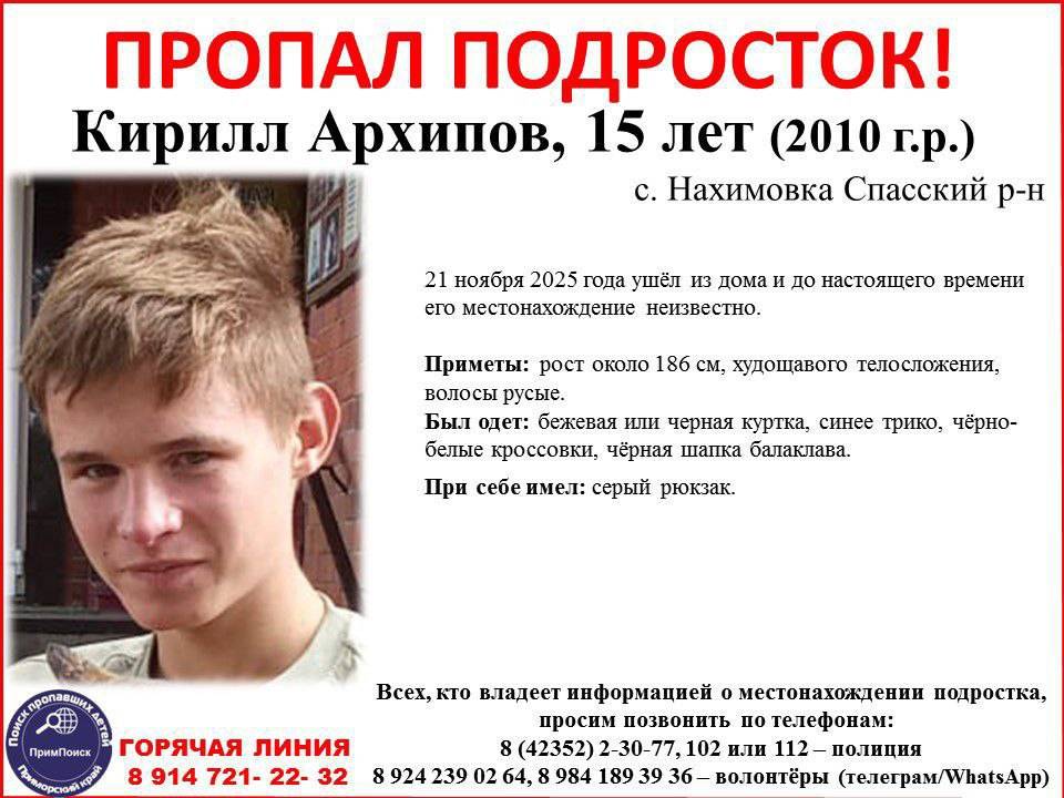 15-летний Кирилл Архипов из села Нахимовка Спасского района 21 ноября 2025 года ушёл из дома и до настоящего времени его местонахождение неизвестно, - сообщает "Вести: Приморье" со ссылкой на "Примпоиск".