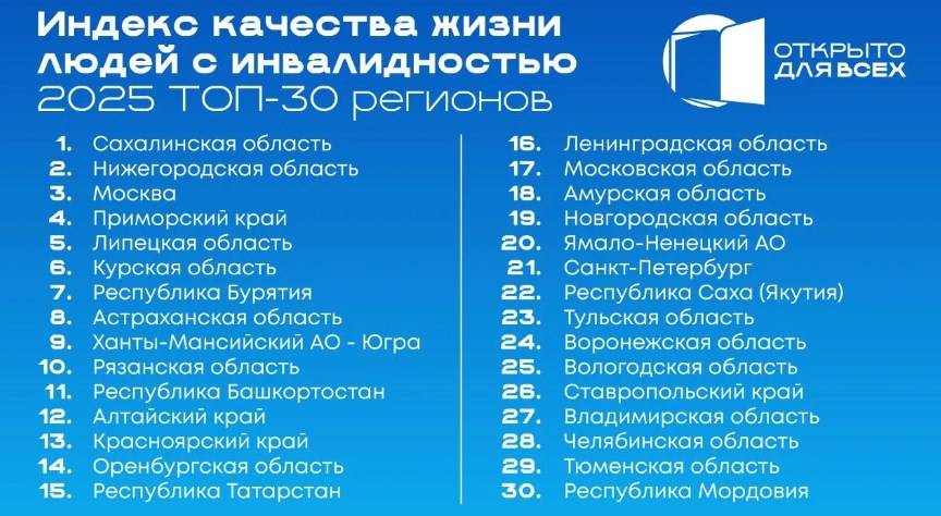 На инклюзивном форуме "Открыто для всех" Агентство стратегических инициатив представило обновлённый рейтинг качества жизни людей с инвалидностью. Индекс формировали по ключевым критериям: доступность городской среды, работа социальных служб и уровень адаптации образовательных учреждений.
