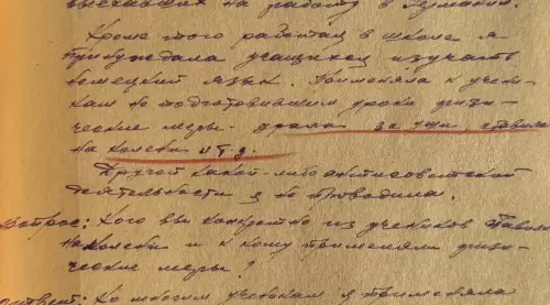 Кроме этого, работая в школе, я принуждала учащихся изучать немецкий язык. Применяла к ученикам, не подготовившим уроки, физические меры - дергала за уши, ставила на колени и т.д.».