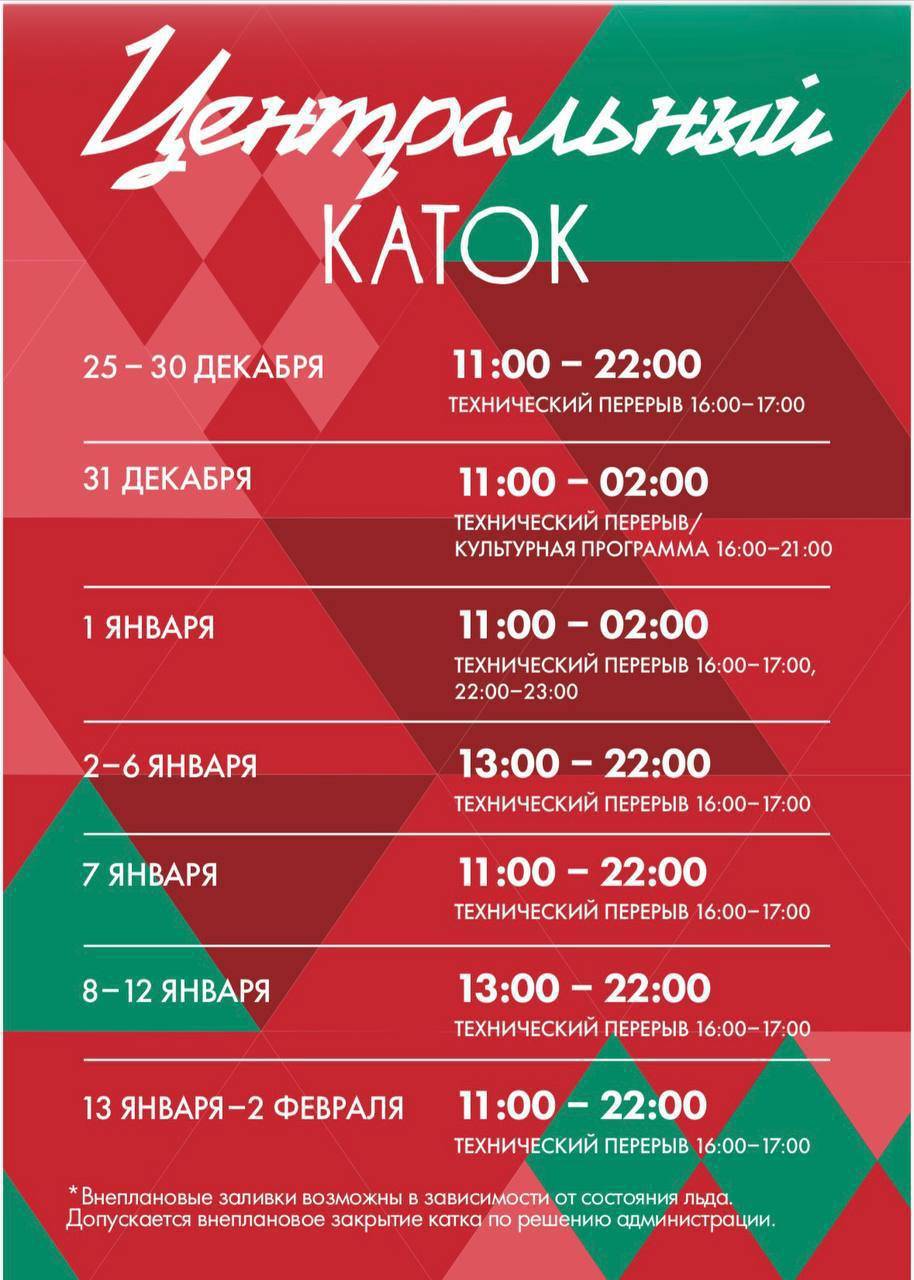 Открыть каток планируют 25 декабря. В этот день и до 30 декабря включительно он будет работать для горожан с 11:00 до 22:00, технический перерыв – с 16:00 до 17:00.