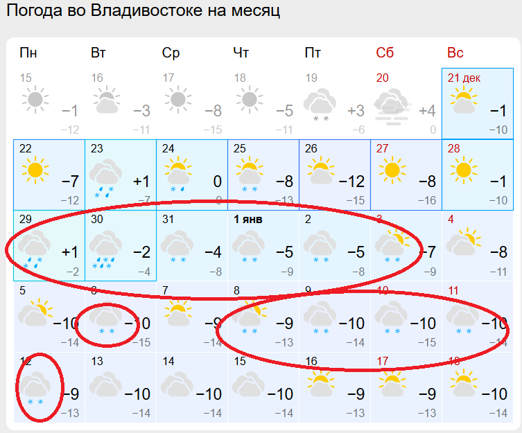 Что касается других метеосайтов, они такие долгосрочные прогнозы не дают. Так, например, данные windy.com говорят о том, что 29 и 30 есть вероятность снега с дождем во Владивостоке, и следующие осадки возможны лишь 5-го января.