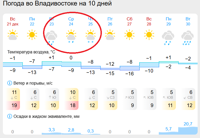 По данным gismeteo.ru, основное ухудшение погоды во Владивостоке ожидается 23 декабря - мокрый снег, 24 декабря - возможен небольшой снег с дождем, также есть вероятность небольшого снега 25 декабря.