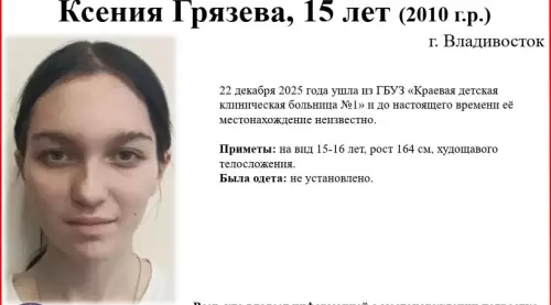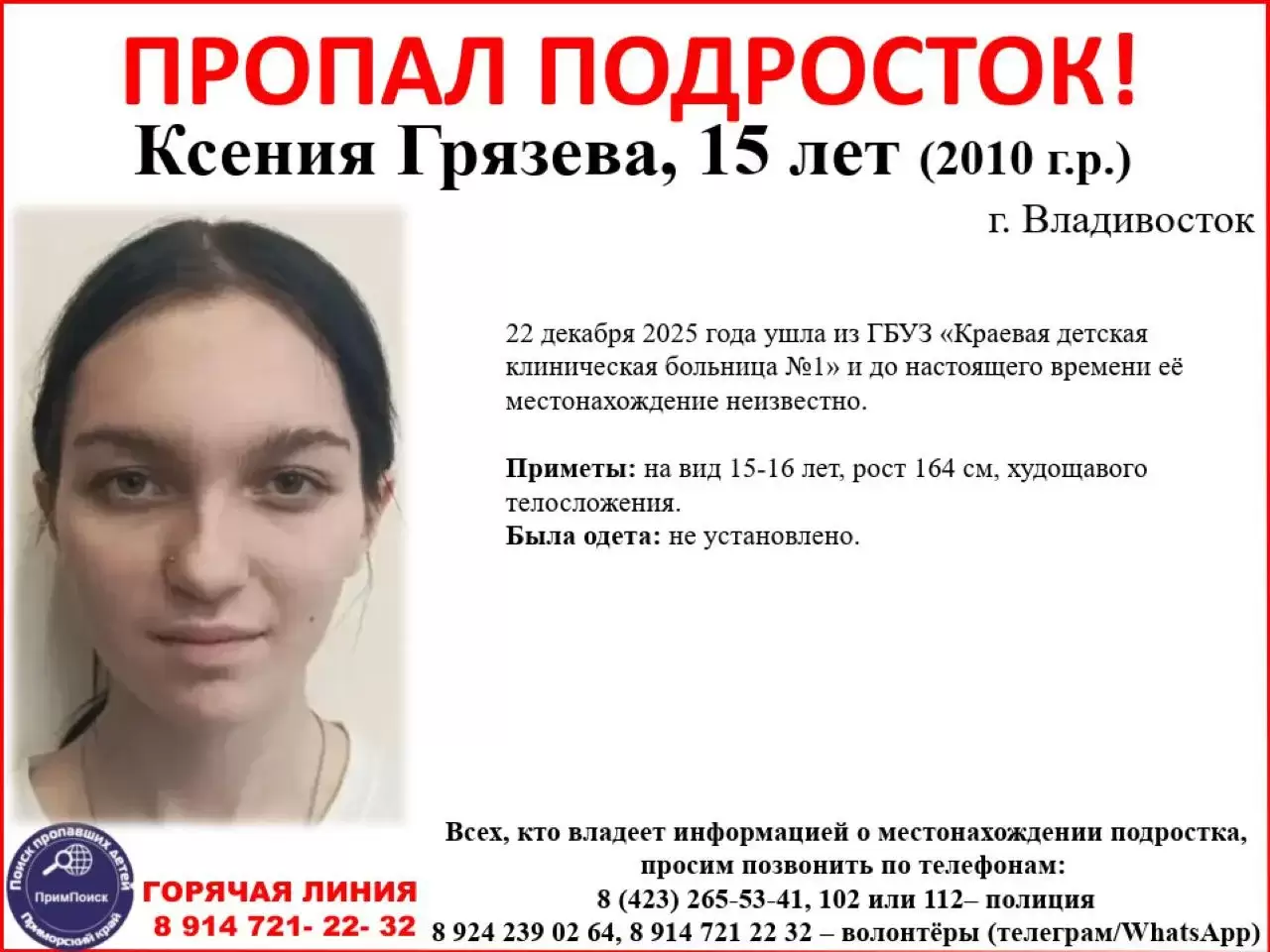 15-летняя Ксения Грязева 22 декабря 2025 года ушла из ГБУЗ «Краевая детская клиническая больница №1» и до настоящего времени её местонахождение неизвестно, - сообщает "Вести: Приморье" со ссылкой на "Примпоиск".