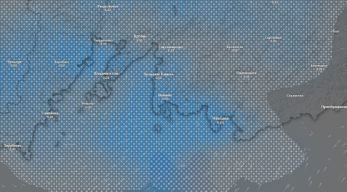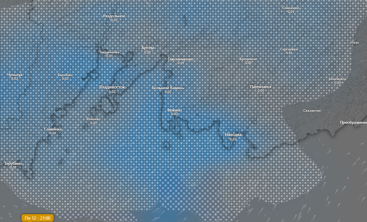 Атмосферный фронт подойдет к краю с юго-запада, соответственно снег будет идти на юге края, в его западной части и на юго-востоке. Есть вероятность снега и в дальневосточной столице. По данным windy.com, осадки начнутся около 21:00 часов вечера и будут идти всего пару часов. На восточном побережье и северо-востоке края осадков вообще может не быть.