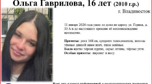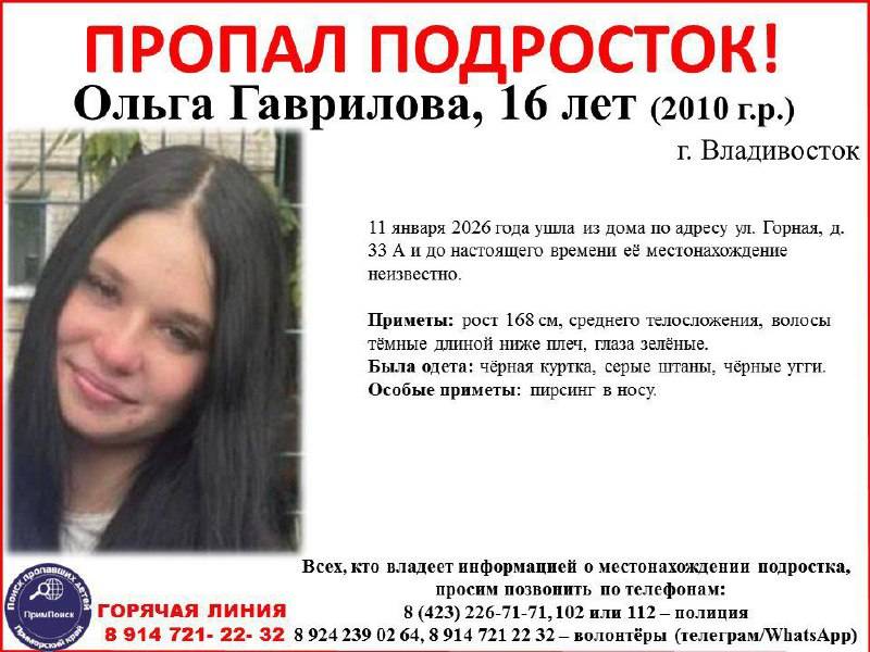 16-летняя Ольга Гаврилова 11 января 2026 года ушла из дома по адресу ул. Горная, д. 33 А и до настоящего времени её местонахождение неизвестно, - сообщает "Вести: Приморье".