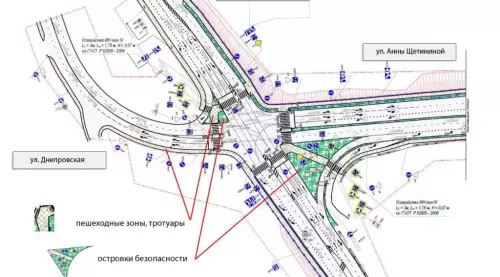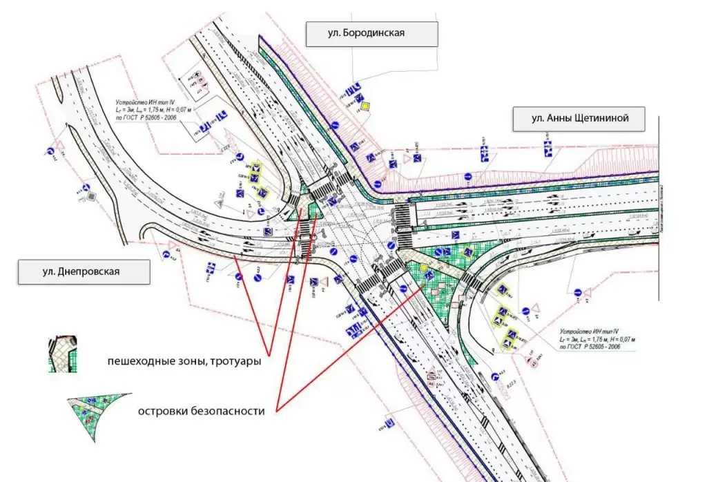 Для безопасности пешеходов появятся тротуары и наземные пешеходные переходы, на пересечении улиц Анны Щетининой, Днепровской и Бородинской - два островка безопасности, через которые будет организовано непрерывное пешеходное пространство.