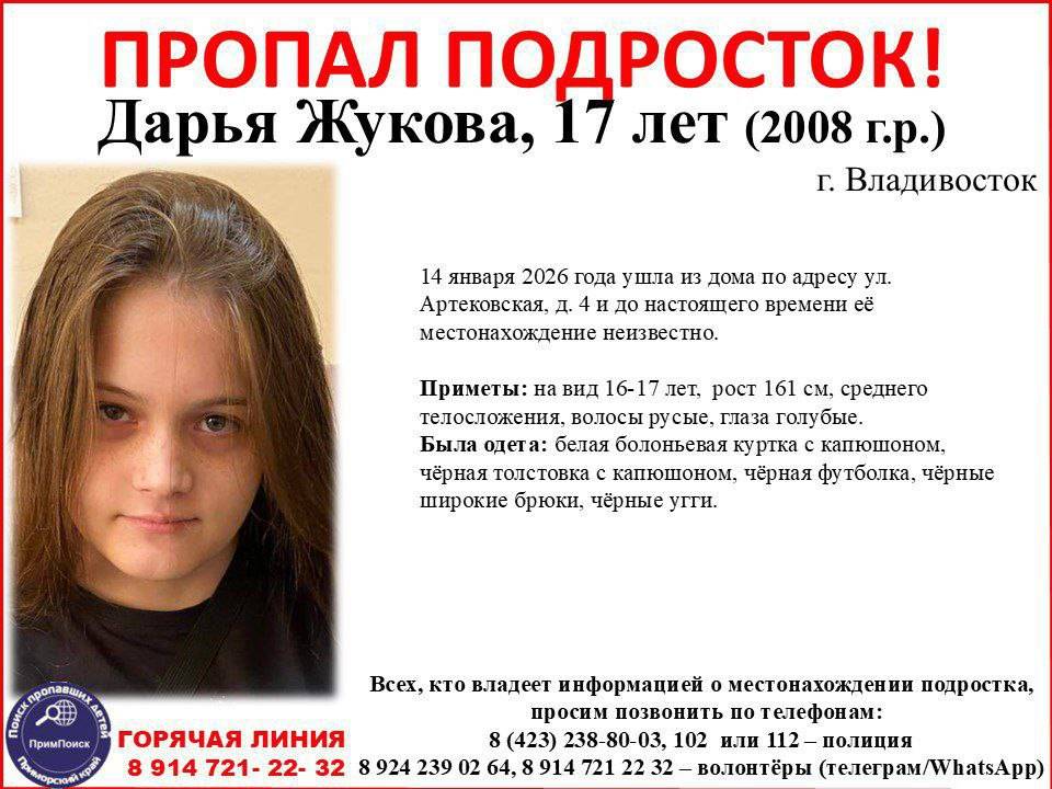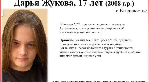 17-летняя Дарья Жукова 14 января 2026 года ушла из дома по адресу ул. Артековская, д. 4 во Владивостоке и до настоящего времени её местонахождение неизвестно, - сообщает "Вести: Приморье" со ссылкой на "Примпоиск".