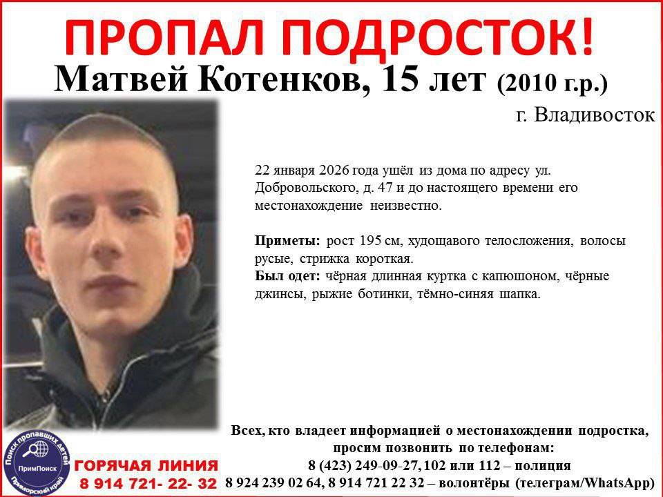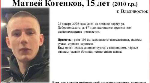 15-летний Матвей Котенков 22 января 2026 года ушёл из дома по адресу ул. Добровольского, д. 47 во Владивостоке и до настоящего времени его местонахождение неизвестно, - сообщает "Вести: Приморье" со ссылкой на "Примпоиск".