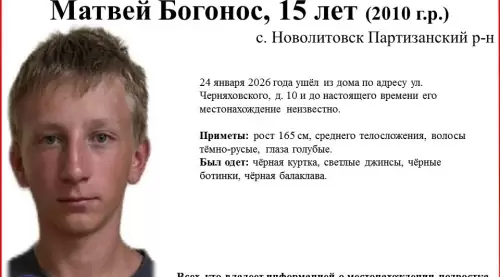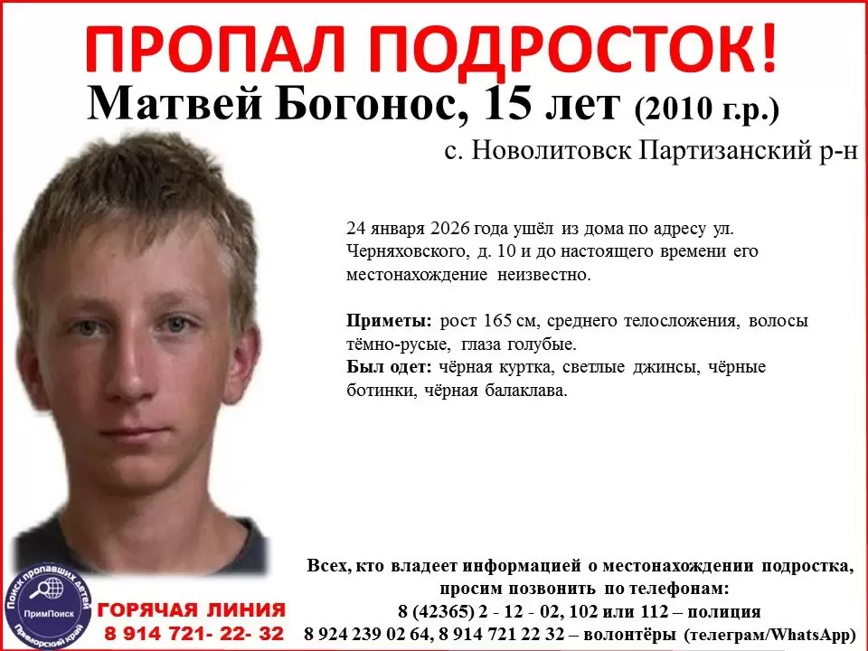 15-летний Матвей Богонос 24 января 2026 года ушёл из дома по адресу ул. Черняховского, д. 10 в Новолитовске и до настоящего времени его местонахождение неизвестно, - сообщает "Вести: Приморье" со ссылкой на "Примпоиск".