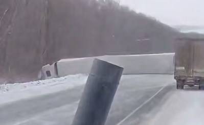 Фура слетела с трассы в Приморье, перекрыв полосу движения