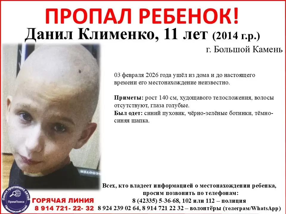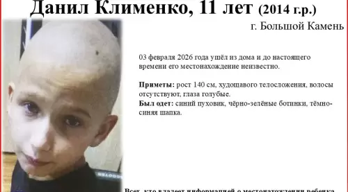 11-летний Данил Клименко 3 февраля 2026 года ушёл из дома в Большом Камне и до настоящего времени его местонахождение неизвестно, - сообщает "Вести: Приморье" со ссылкой на "Примпоиск".
