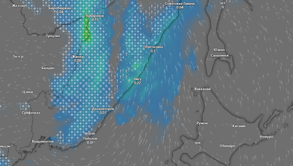 Активная карта windy.com подтверждает этот прогноз. Причем смешанные осадки ожидаются, в том числе, во Владивостоке. По предварительным данным, облачная шапка подойдет с запада, осадки начнутся во второй половине дня 22 февраля, и к ночи распространятся на большую часть края.