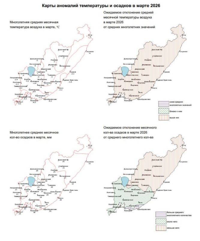 Прогноз аномалий температуры воздуха и осадков по Приморскому краю на март 2026 года обнародовали синоптики Примгидромета.