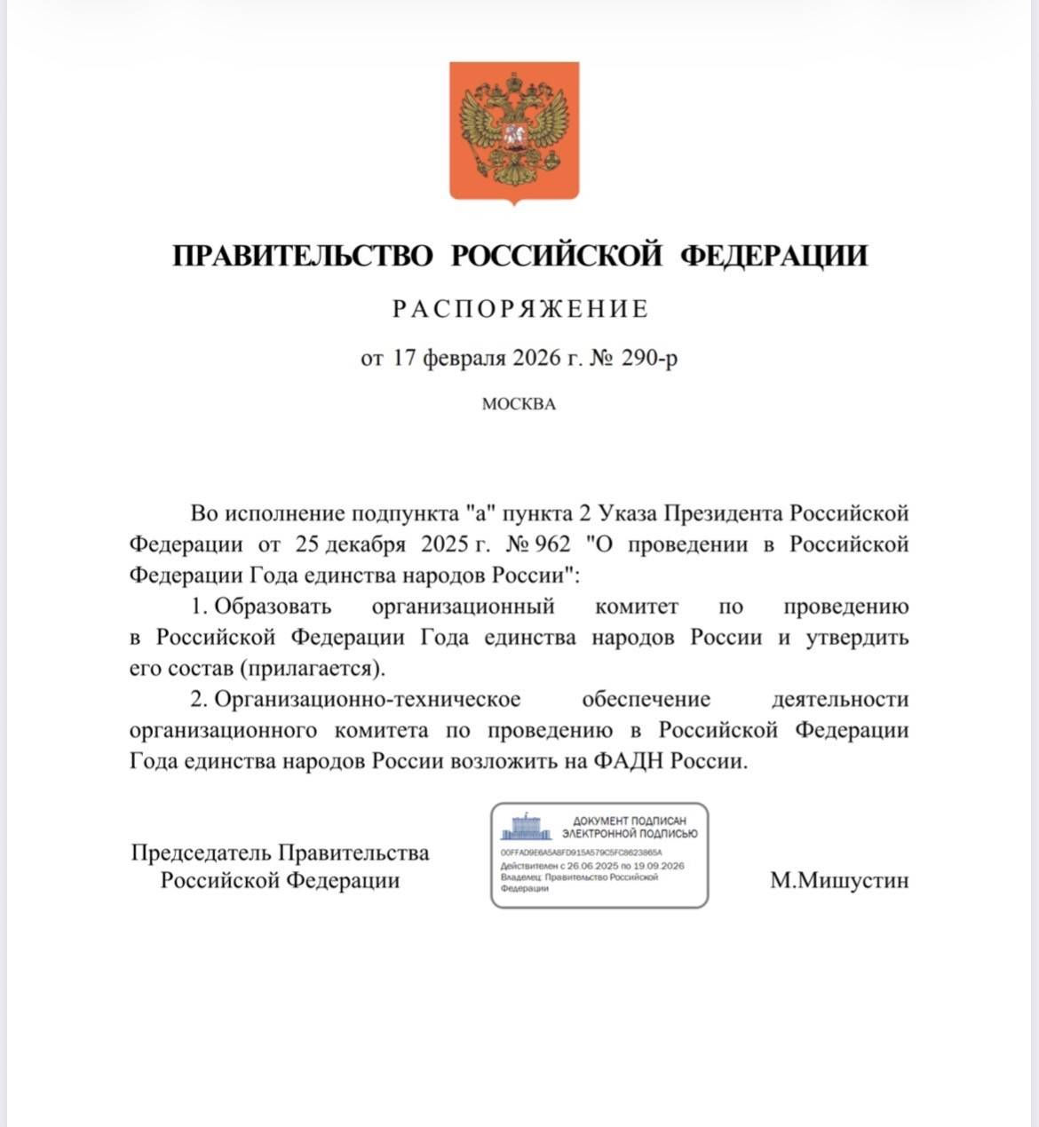 Михаил Мишустин подписал распоряжение о создании оргкомитета по проведению Года единства народов России
