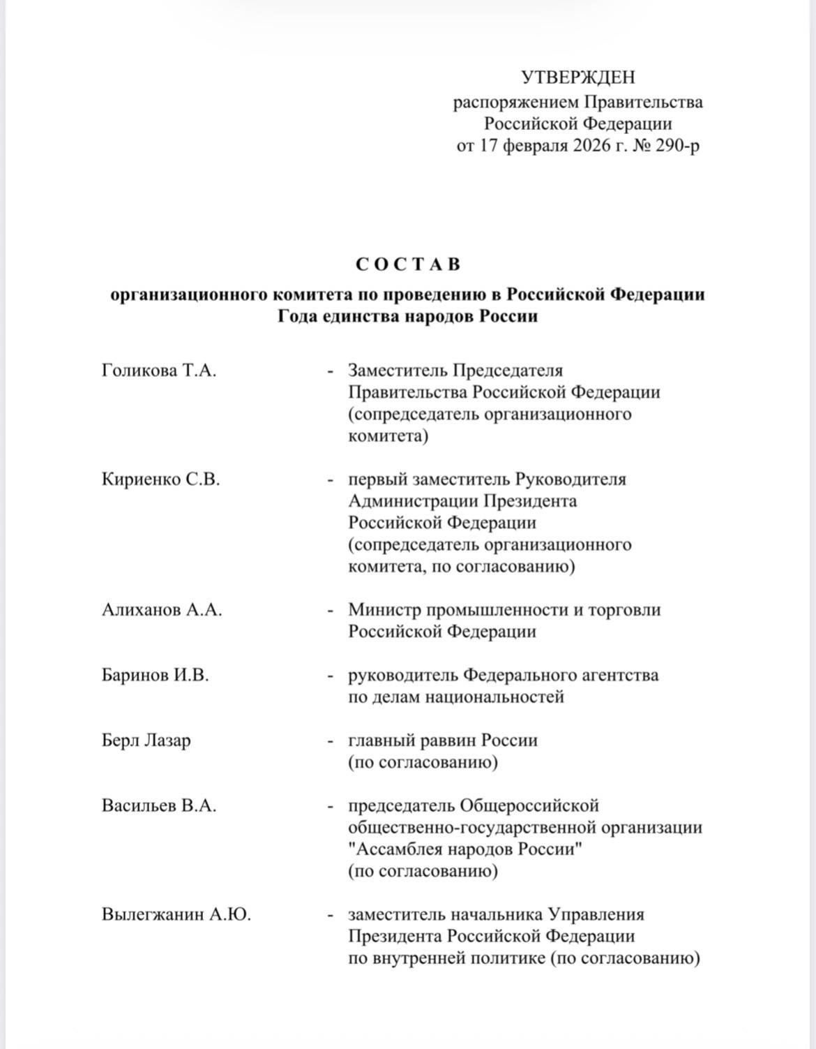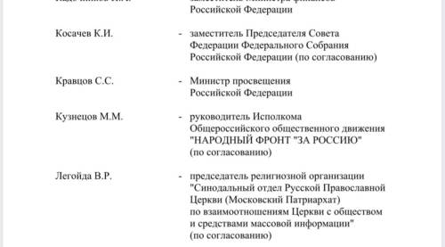 Согласно распоряжению, руководить работой комитета будут заместитель Председателя Правительства Татьяна Голикова и первый заместитель главы Администрации Президента РФ Сергей Кириенко.