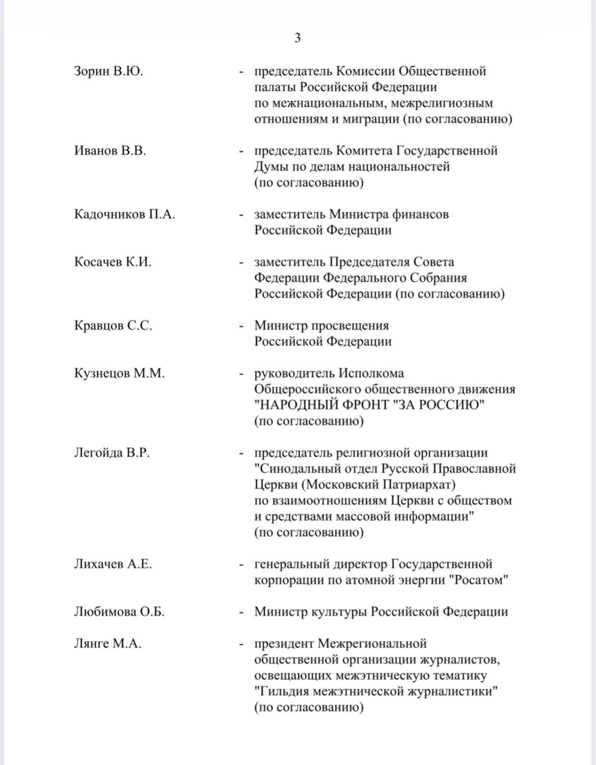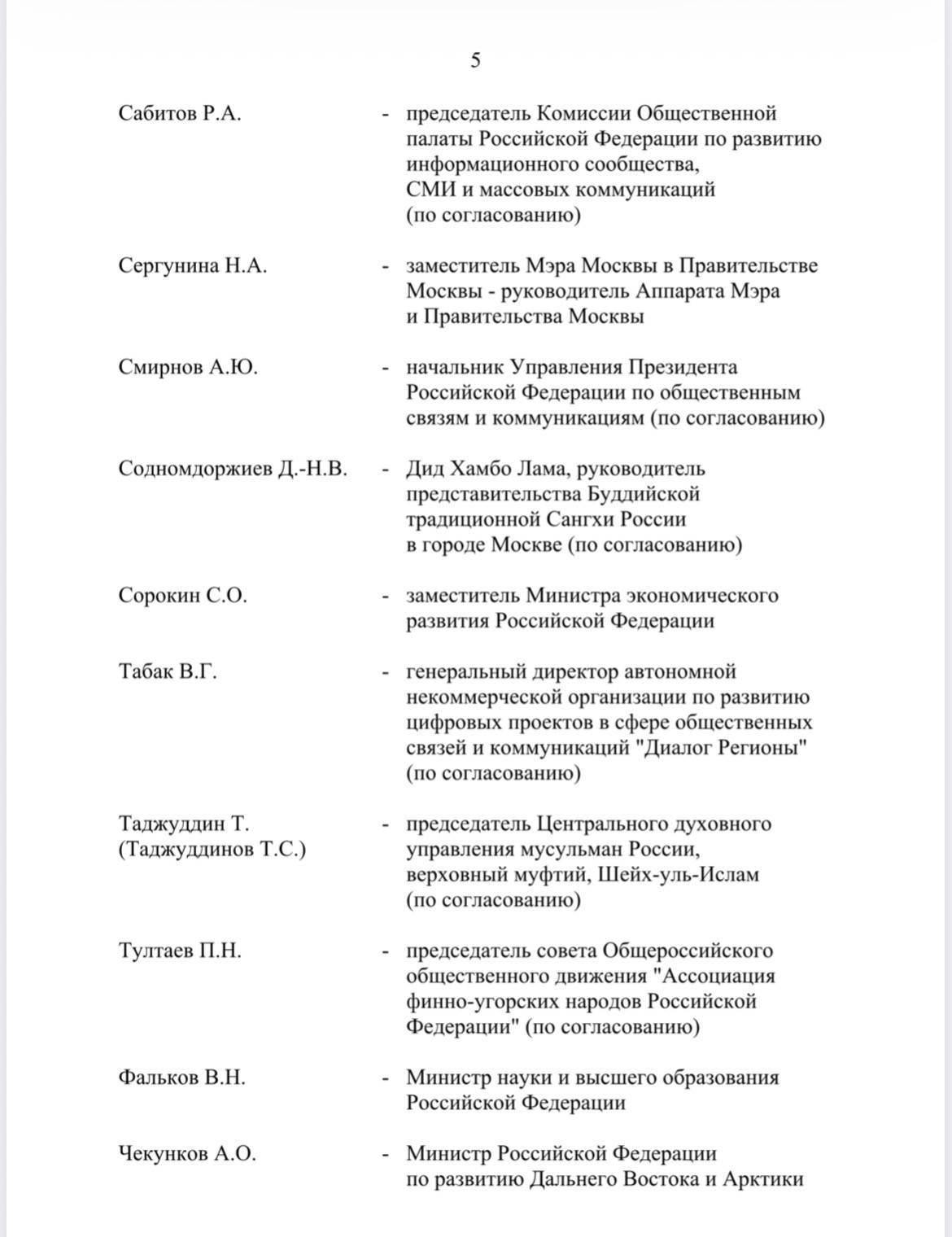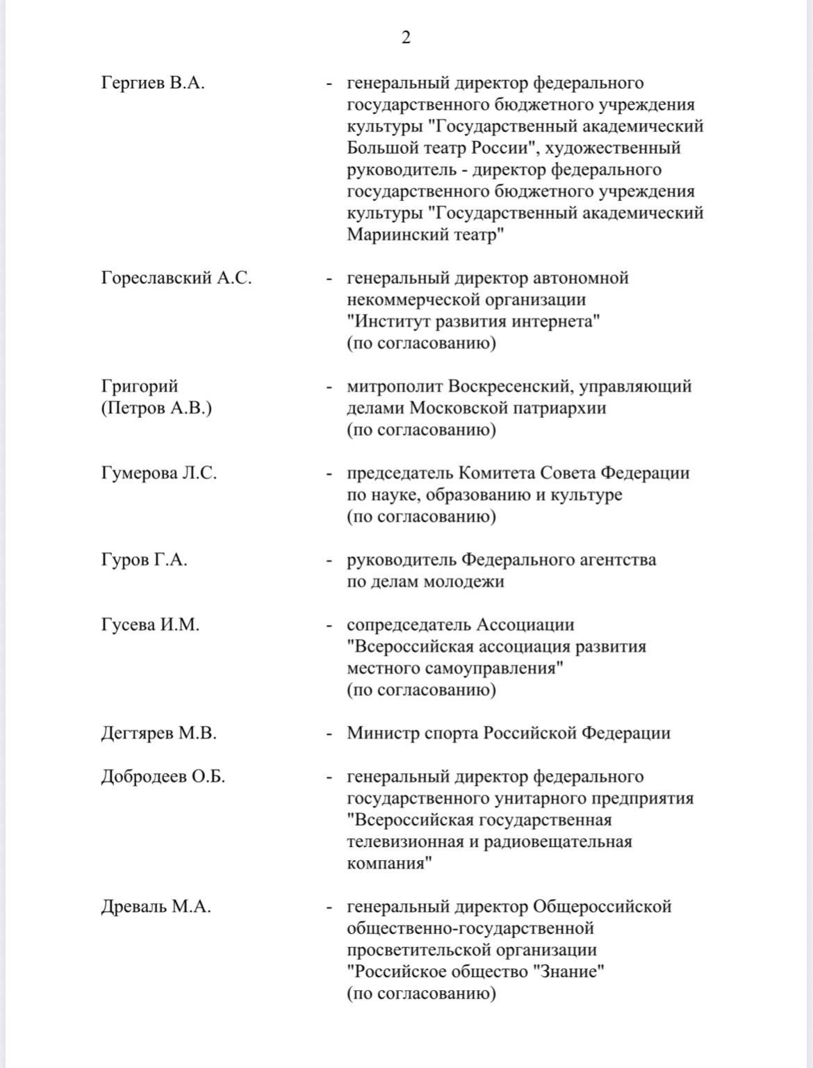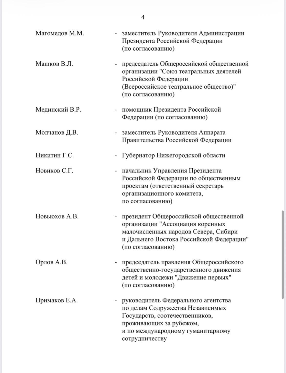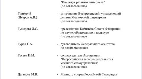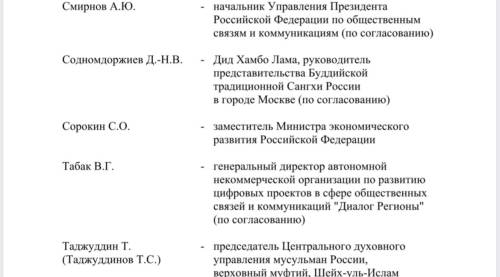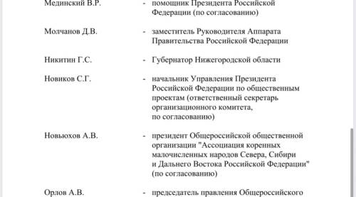 В комитет также включены представители федеральных ведомств, общественных и религиозных организаций. В частности, в него вошли министр промышленности и торговли Антон Алиханов, помощник президента России Владимир Мединский, глава Минобрнауки Валерий Фальков, министр по развитию Дальнего Востока и Арктики Алексей Чекунков, руководитель ФАДН Игорь Баринов, министр культуры Ольга Любимова, генеральный директор ВГТРК Олег Добродеев, председатель Комиссии Общественной палаты РФ по развитию информационного сообщества, СМИ и массовых коммуникаций, заместитель генерального директора — руководитель регионального департамента ВГТРК Рифат Сабитов, генеральный директор Института развития интернета (ИРИ) Алексей Гореславский, главный раввин России Берл Лазар, председатель Союза театральных деятелей РФ Владимир Машков, руководитель Большого театра России и Мариинского театра Валерий Гергиев и другие.