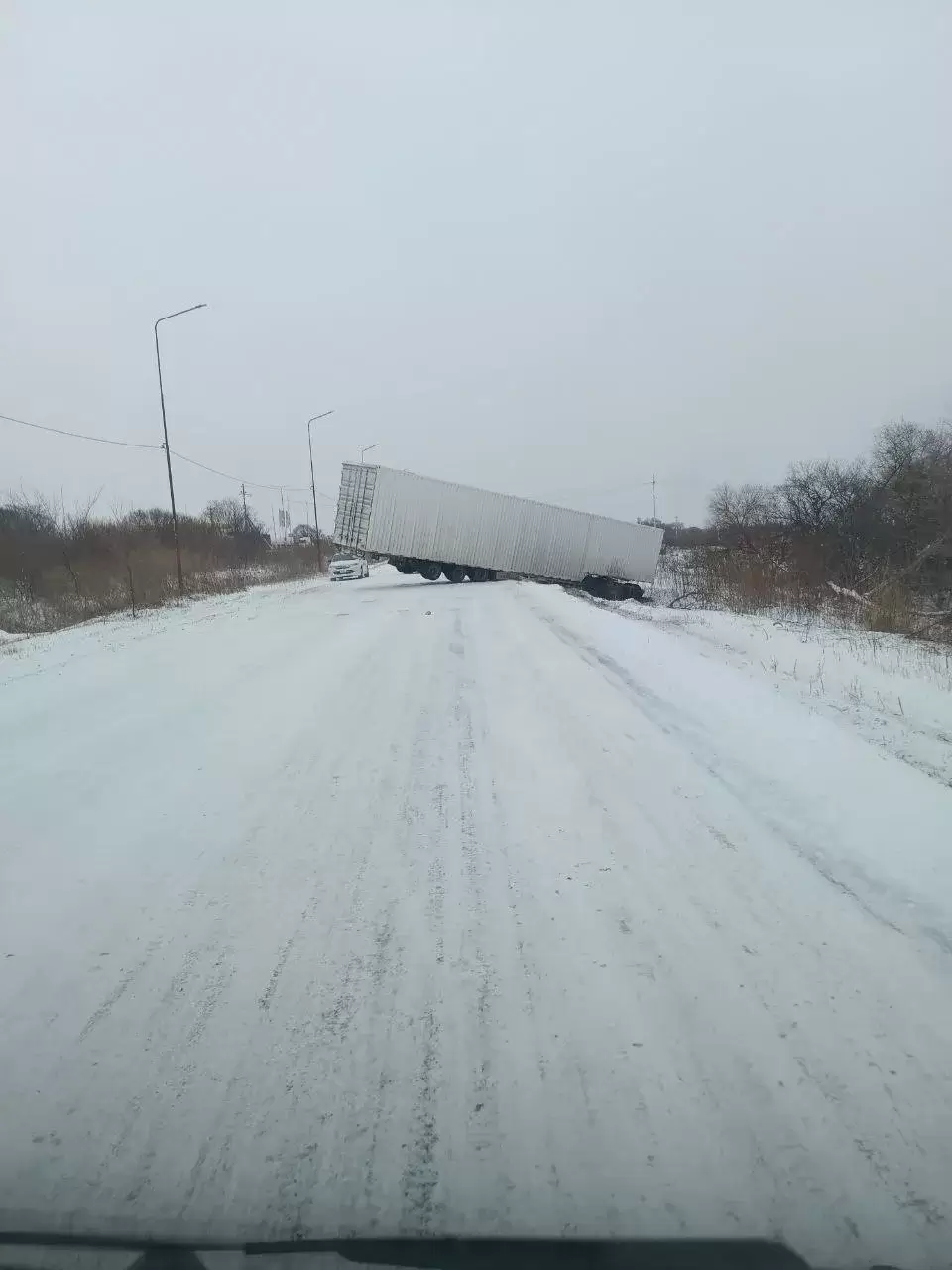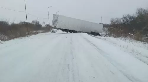 Авария случилась недалеко от Новоникольска, водитель большегруза не справился с управлением на скользкой дороге и фура ушла в кювет.