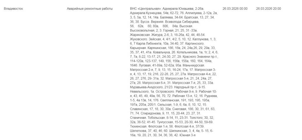 Массовое аварийное отключение холодной воды запланировано во Владивостоке