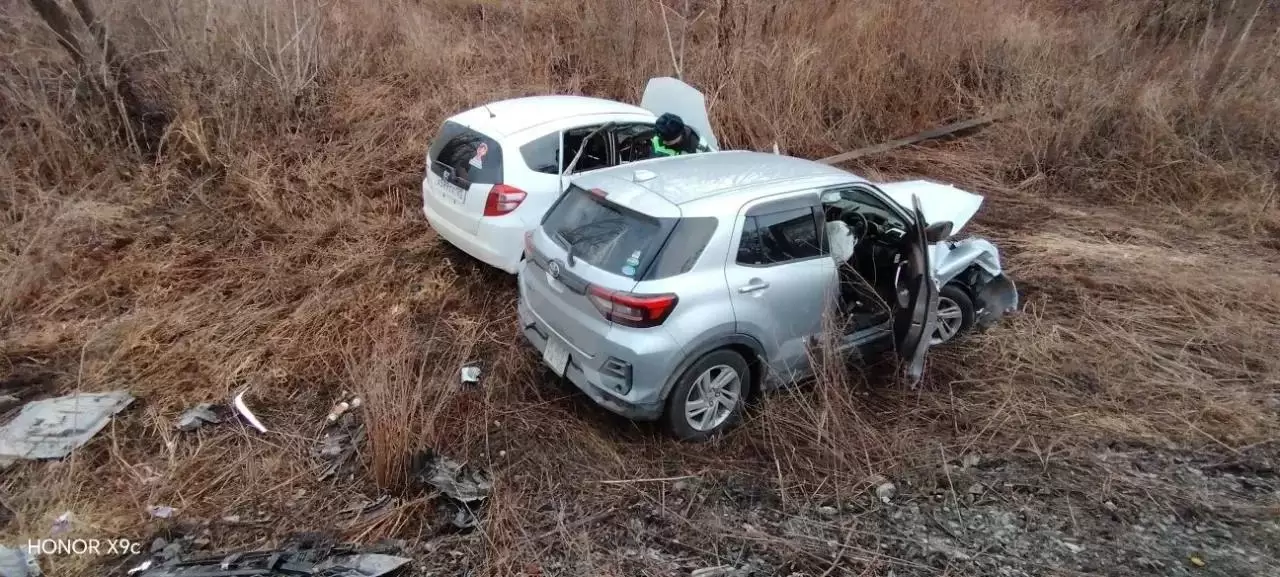 48-летний водитель Honda Fit не учёл дорожные и метеорологические условия. Вследствие этого он не справился с управлением, выехал на встречную полосу, где столкнулся с Toyota Raize. В итоге обе машины оказались в кювете. Момент происшествия попал на видео.