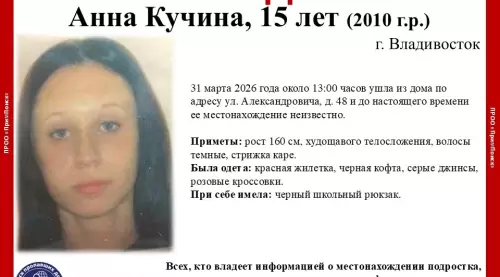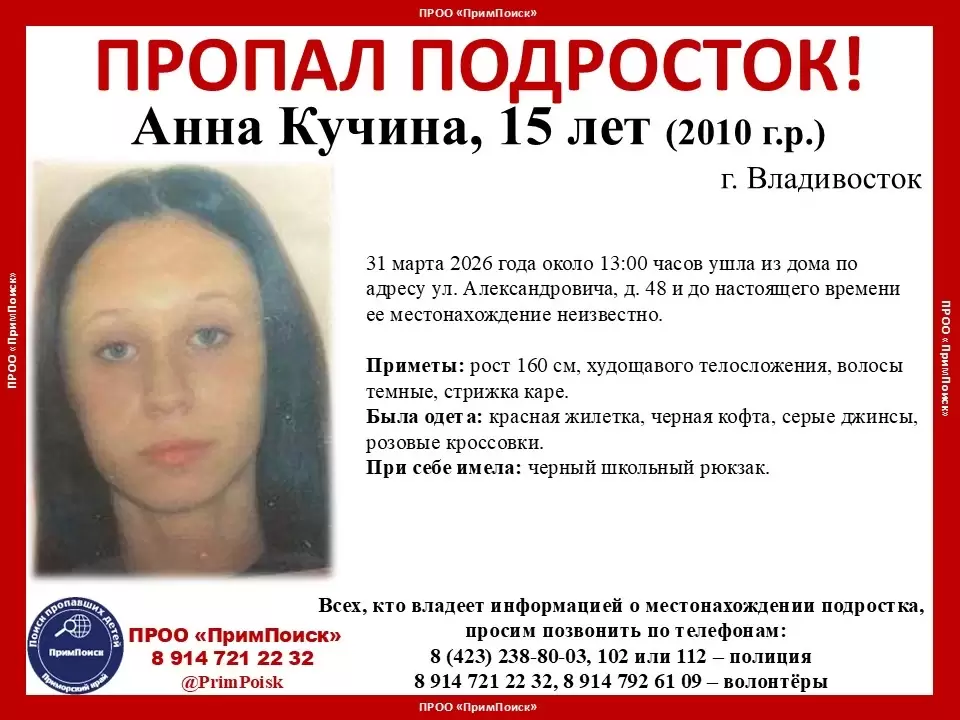 15-летняя Анна Кучина 31 марта 2026 года около 13:00 часов ушла из дома по адресу ул. Александровича, д. 48 и до настоящего времени ее местонахождение неизвестно, - сообщает "Вести: Приморье".