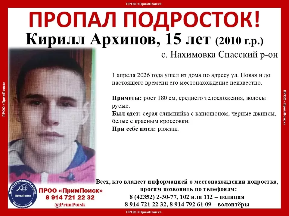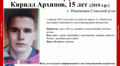 15-летний Кирилл Архипов из села Нахимовка Спасского района 1 апреля 2026 года ушел из дома по адресу ул. Новая и до настоящего времени его местонахождение неизвестно, - сообщает "Вести: Приморье".